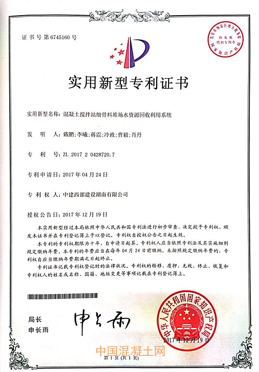 截止目前,中建西部建設湖南有限公司共獲得國家專利授權7項,其中發明專利授權4項,實用新型專利授權3項。