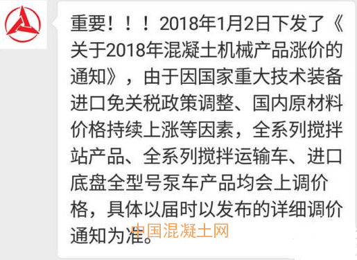 繼裝載機挖掘機之后,混凝土機械也將提價。2018年1月初,有三一混凝土機械經(jīng)銷商接到廠家通知,混凝土機械也將全面提價。