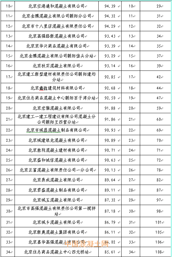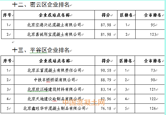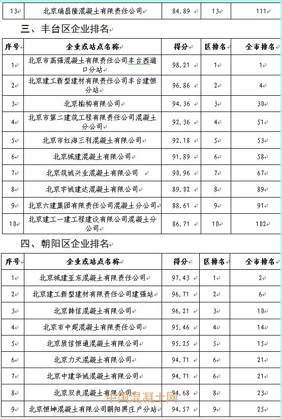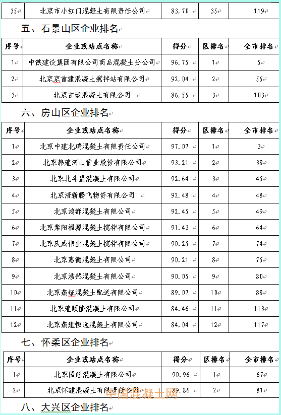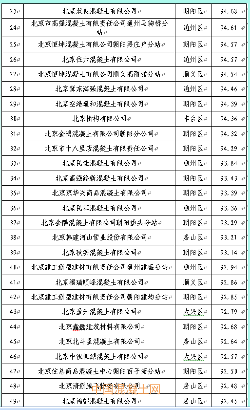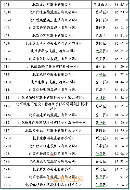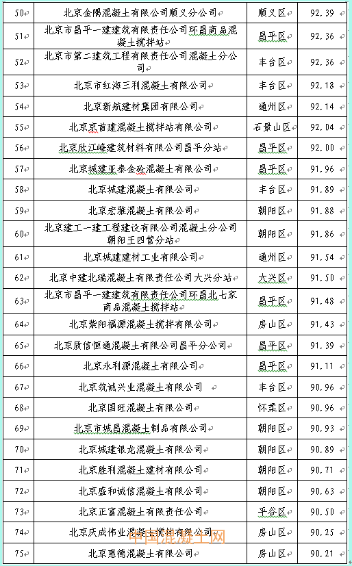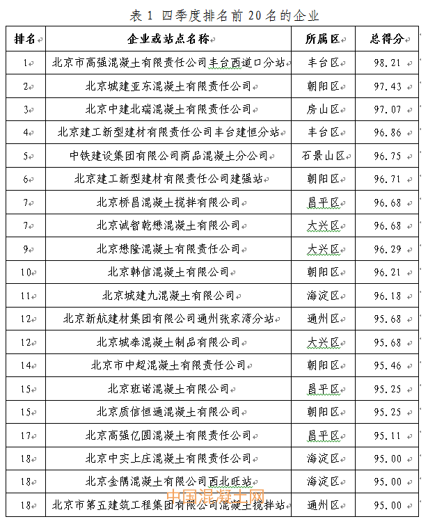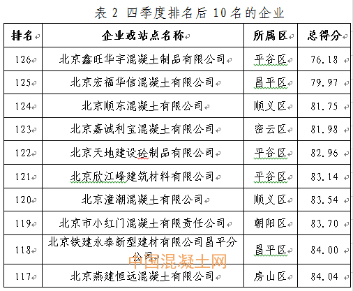 本季度得分最高的企業(yè)為北京市高強(qiáng)混凝土有限責(zé)任公司豐臺(tái)西道口分站98.21分,得分最低的企業(yè)為北京鑫旺華宇混凝土制品有限公司76.18分,全市混凝土企業(yè)得分排名詳見附件2。