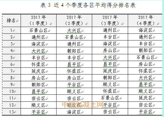 按126家混凝土企業(yè)所屬的13個(gè)轄區(qū)進(jìn)行評(píng)估分析,四季度評(píng)估平均分前5名的區(qū)為:海淀區(qū)、通州區(qū)、豐臺(tái)區(qū)、朝陽(yáng)區(qū)、石景山區(qū)。其中通州區(qū)已連續(xù)5個(gè)季度排名全市前3名,豐臺(tái)區(qū)已連續(xù)4個(gè)季度排名全市前5名,石景山區(qū)本季度得分排名提升明顯。評(píng)估平均得分后3名的區(qū)為:延慶區(qū)、密云區(qū)、平谷區(qū),其中平谷區(qū)和密云區(qū)已連續(xù)5個(gè)季度排名靠后(近4個(gè)季度各區(qū)平均得分排名見表3)。本季度各區(qū)企業(yè)得分排名見附件3。