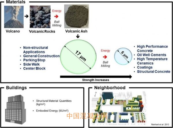 研究人員發(fā)現(xiàn),用火山灰替代50%的傳統(tǒng)水泥,其顆粒大小為17微米,所形成的混凝土的隱含能源減少了16%,盡管這阻礙了材料的整體強(qiáng)度。將火山灰顆粒減少到6微米左右的大小,通過(guò)為水和水泥粘結(jié)在一起創(chuàng)造更多的表面積,極大地提高了它的強(qiáng)度。