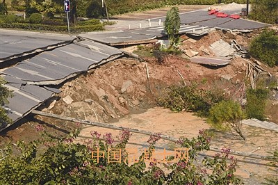 事故現(xiàn)場可以看到,地陷面積約兩個籃球場大,深度約6到7米,瀝青路段大段脫落,有路燈掉入坑中。