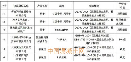 通報顯示,2017年,北京市住房城鄉建設委組織開展了全市預拌混凝土生產企業原材料使用情況專項檢查,并委托建材檢測機構對部分混凝土攪拌站(點)的原材料進行了抽樣檢測。檢查發現,懷安潤祥建材經銷有限公司、淶水縣潤鑫建材、懷來縣瑞云觀鄉東灣采砂廠、北京楊楊潤華科技開發有限責任公司、北京天佐方元商貿有限公司、山東隆高商貿有限公司等6家企業供應的混凝土原材料共計6組抽檢樣品經檢測判定為不合格。