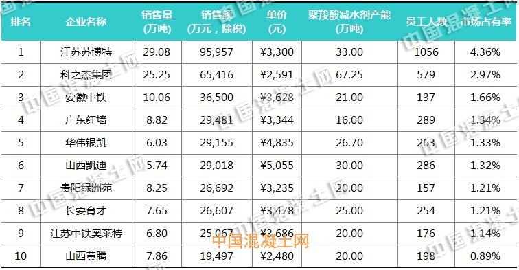 “奧克杯”2016年中國聚羧酸減水劑企業十強