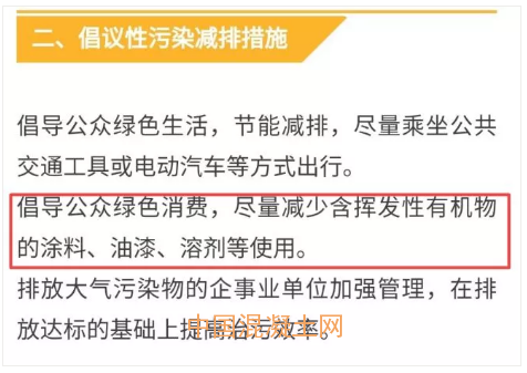 倡導(dǎo)公眾綠色消費(fèi),單位和公眾盡量減少含揮發(fā)性有機(jī)物的涂料、油漆、溶劑等原材料及產(chǎn)品的使用。