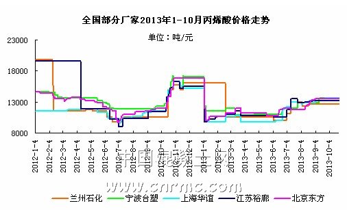 隨著之前停車檢修的廠家重新開車,10月份企業開工率將回升,市場供應量將逐漸恢復,屆時將相對充足,丙烯酸價格在此期間也將有所上漲,但上漲期間過后將會逐步進入到平穩過渡期間。目前丙烯酸普酸價格在13300元/噸附近,比7月初上漲約2000元/噸,增幅達16.67%,9、10月份的價格處于年內價格最高點。因此中國混凝土網預計,在下游需求比較穩定的情況下,2013年年底之前,產品價格很難再繼續上漲,但如果未來下游行業需求繼續保持良好,價格能保持穩定,并維持在高位的話,那么2013年總體情況相對于2012年來說還是不錯的。