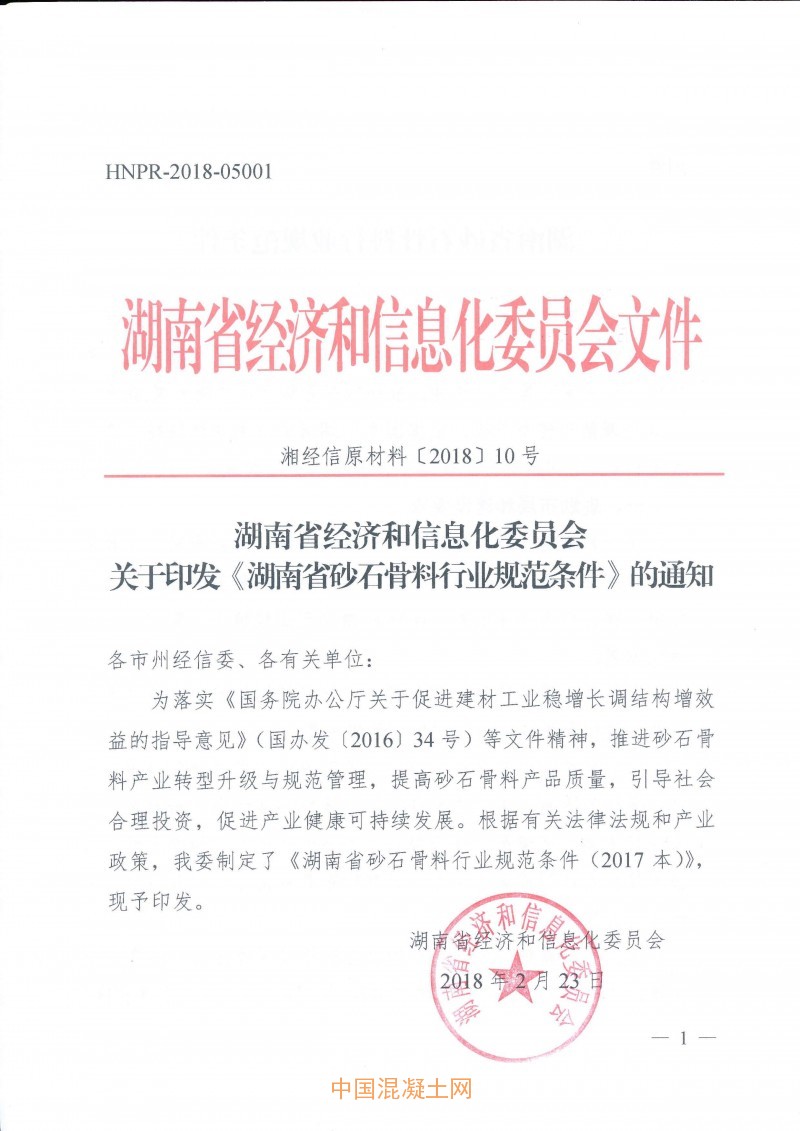 2018年3月2日,湖南省經信委《關于印發〈湖南省砂石骨料行業規范條件〉的通知》(湘經信原材料[2018]10號,以下簡稱《規范條件》)。該《規范條件》作為全省規范性文件已報省人民政府登記,經省政府法制辦審查并依法登記,統一登記號:HNPR—2018—05001。