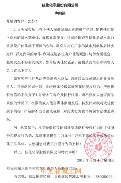 因近期聽聞市場有個別人在群發減水劑的推廣信息,銷售佳化旗下商標的減水劑單體,價格異常便宜。今日(4日)佳化化學股份有限公司發布聲明函,稱經公司調查發現,此類減水劑乃重復使用佳化旗下商標的包裝,填充入其他廠家的減水劑單體后以次充好,冒充佳化化學的單體。在此,提請各位客戶理智甄別,切勿貪小便宜,避免發生不必要的損失。