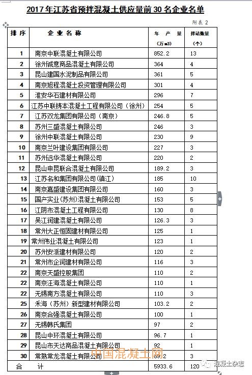 附表2:《 2017年江蘇省預拌混凝土供應量前30名企業名單》