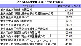 根據(jù)統(tǒng)計(jì),2013年上半年重慶混凝土企業(yè)數(shù)量達(dá)到了115家,較2012年同期增加了18家,由此可以看出今年混凝土產(chǎn)量的增長與企業(yè)數(shù)量的增加有著一定的關(guān)系。另外,除了一些新晉的本土企業(yè)外,冀東重慶、中建商砼重慶分公司也赫然在列??梢?,冀東等大型混凝土企業(yè)也欲在重慶市場(chǎng)大展拳腳。今年混凝土產(chǎn)量的增長與企業(yè)數(shù)量的增加有著一定的關(guān)系。另一方面,從重慶混凝土十強(qiáng)企業(yè)來看,往年的大型企業(yè)今年發(fā)展卻不盡如人意。從圖中可以看到,除了重慶三圣有明顯增長外,其他十強(qiáng)企業(yè)產(chǎn)量大都出現(xiàn)了負(fù)增長,排名也出現(xiàn)了較大的波動(dòng)。原因在于重慶混凝土行業(yè)增速逐漸放緩,企業(yè)增多,需求量減少,銷量隨之下降。