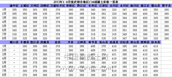 2012年,由于重慶市混凝土增速趨于平穩(wěn),市場(chǎng)需求減弱,再加上水泥市場(chǎng)疲軟等因素,全市混凝土價(jià)格一降再降,最后以350元/方收尾。2013年3月,受城鎮(zhèn)化政策影響,全市混凝土價(jià)格有所上漲,達(dá)到了375元/方。此后隨著淡季的日益臨近,市場(chǎng)價(jià)格有所波動(dòng),但是幅度不大,截至6月底,全市混凝土價(jià)格維持在370元/方。