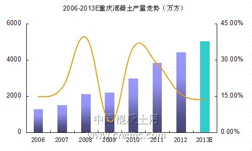 自2010年之后,重慶市商品混凝土產(chǎn)量增速逐漸放緩。2012年,全市完成商品混凝土產(chǎn)量4427萬立方米,較2011年增長15.89%,增速下降了12.34個(gè)百分點(diǎn)。其中主城區(qū)完成混凝土產(chǎn)量2777萬方,非主城區(qū)完成混凝土產(chǎn)量1709萬方。此外,根據(jù)重慶混凝土協(xié)會(huì)數(shù)據(jù)顯示,截至2013年6月,全市預(yù)拌混凝土總產(chǎn)量達(dá)到了2421.48萬方,較2012年增長了16.56%,且砼網(wǎng)預(yù)計(jì)全年重慶市預(yù)拌混凝土產(chǎn)量或可突破5000萬方大關(guān)。