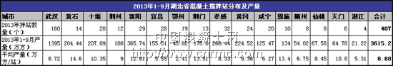 據中國混凝土網的不完全統計,截止2013年9月,湖北預拌混凝土拌站數量達407家,較2012年新增62家。根據湖北省散裝辦公布的數據顯示,全省1-9月預拌混凝土累計總產量達3615.23萬方,較2012年同期增長15.19%。今年全省預拌混凝土供應量計劃完成5000萬方,現已完成計劃總進度的72.3%。
