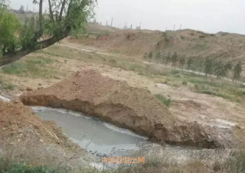 在307國道邊的君澤豪庭小區后面記者找到了一家,未到廠區老遠就看見罐體上噴有“陜西泰合”字樣的四個水泥罐。在廠區大門口記者看見作業產生的污水順著路面一直流到路邊自行挖出來的大坑里!大坑也沒有做任何防滲漏措施,生產剩余的廢料就直接堆在廠區外面嚴重污染了環境。