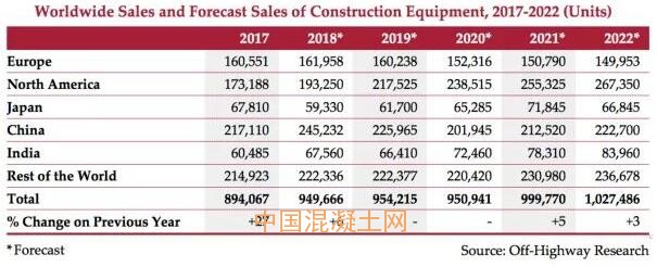 鑒于特朗普政府出臺的萬億美元基礎設施建設計劃,英國工程機械咨詢有限公司同時預見了未來四年北美地區將迎來的大幅增長,2022年北美工程機械銷量或達267,350臺,預計增長54%。