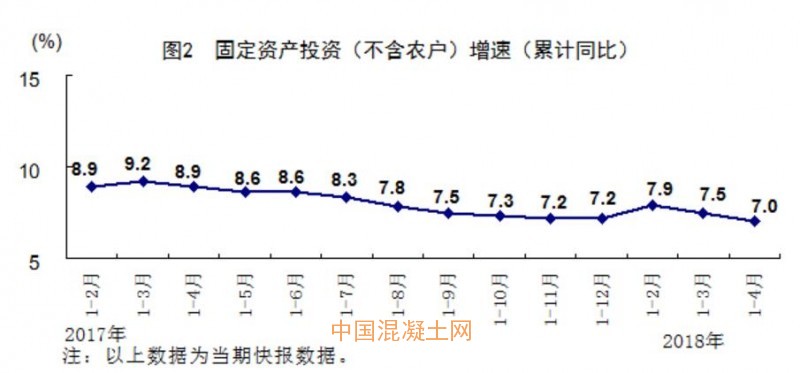 2018年1-4月份,全國固定資產投資(不含農戶)15.44萬億元,同比增長7%,增速較一季度回落0.5個百分點,低于去年同期1.9個百分點。從環比速度看,4月份固定資產投資(不含農戶)增長0.52%。