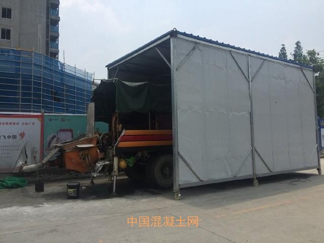 隔音棚共做了2個,裝了輪子,可以跟隨車輛移動。每個棚子約7米長、4米寬、4米高,可以容納一輛混凝土泵車。打混凝土時,車輛進入棚內,半封閉形式,因為板子里面有隔音棉,所以噪聲可以降低40%。施工人員現場測試了一下,露天作業和棚內作業相比,噪聲從100多分貝降到60多分貝。