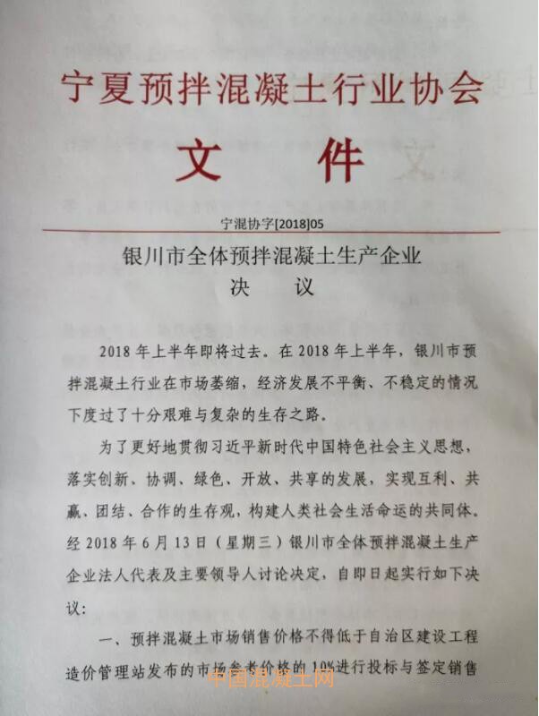 25日,寧夏混凝土行業協會發布《銀川市全體預拌混凝土生產企業決議》,2018年上半年,銀川預拌混凝土行業在市場萎縮,經濟發展不平衡、不穩定的情況下度過了十分艱難與復雜的生存之路。6月13日,銀川市全體預拌混凝土生產企業法人代表及主要領導人討論決定,自即日起實行如下決議: