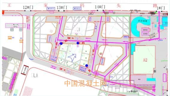 第二階段澆筑剩余所有區(qū)域,合計約7058方砼。此階段交通疏導壓力大,為保證澆筑作業(yè)能有條不紊地進行,項目部技術現(xiàn)行進行場地規(guī)劃,對澆筑過程中的3臺汽車泵+1臺備用泵+3個溜槽直卸料斗進行運行模擬,設定場內(nèi)外蓄車區(qū)域,確定施工現(xiàn)場行車澆搗路線,增設罐車洗車點,盡可能減少罐車候車時間,力爭做到即澆即走。