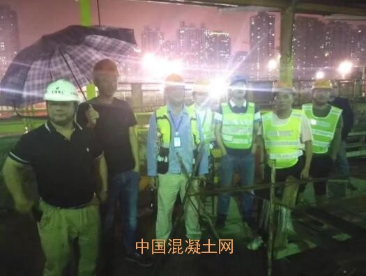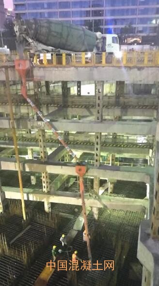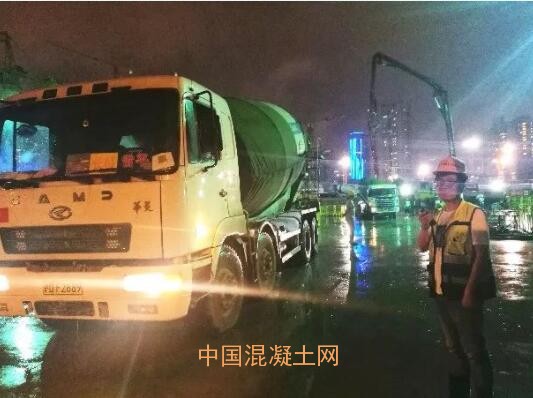 6月22日19:30,管理人員指揮泵車就位, 第一罐混凝土到達現(xiàn)場