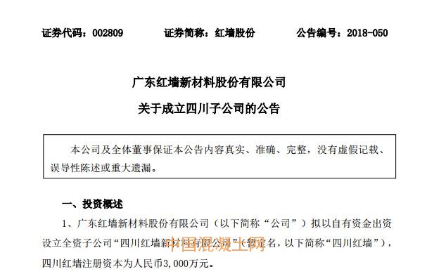 7月1日,紅墻股份(002809)發(fā)布公告表示,擬以自有資金出資設(shè)立全資子公司“四川紅墻有限公司”(暫定名,以下簡稱“四川紅墻”),四川紅墻注冊資本為人民幣3,000萬元。經(jīng)營范圍為混凝土外加劑的生產(chǎn)、銷售;普通貨運。