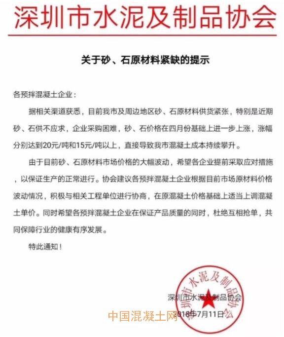 與此同時,廣東地區砂石緊缺,甚至出現斷供,廣州、深圳混凝土協會相繼發出提示函,提示各混凝土企業提前采取應對措施,以保證生產的正常進行。