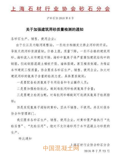 23日,上海石材行業協會砂石分會發布《關于加強建筑用砂質量檢測的通知》,要求砂石生產、銷售、使用企業加大對建筑用砂中氯離子含量的檢測力度,絕不允許海砂用于上海市混凝土與砂漿的生產。