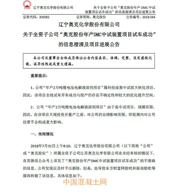 1、此次公司所屬全資子公司江蘇奧克化學(xué)有限公司試車成功的是萬噸級(jí)碳酸乙烯酯中試裝置試車成功,不是“DMC中試裝置投料順利試車成功?!?