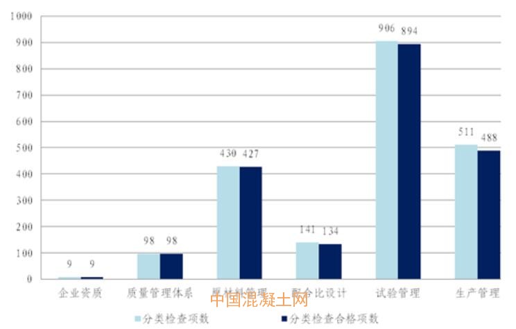 二季度專項(xiàng)執(zhí)法檢查內(nèi)容包括:預(yù)拌混凝土企業(yè)資質(zhì)、質(zhì)量管理體系、原材料管理、配合比設(shè)計(jì)、試驗(yàn)管理、生產(chǎn)管理等方面。本季度共計(jì)檢查預(yù)拌混凝土企業(yè)50家次,檢查項(xiàng)數(shù)2095項(xiàng),其中合格2050項(xiàng),合格率為97.9%??傮w來看,北京市預(yù)拌混凝土企業(yè)質(zhì)量管理情況保持良好,企業(yè)資質(zhì)和質(zhì)量管理體系未出現(xiàn)不合格項(xiàng),不合格項(xiàng)主要出現(xiàn)在試驗(yàn)管理和生產(chǎn)管理方面(具體情況見圖1)。