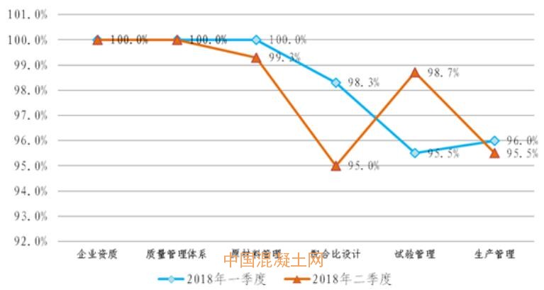與一季度相比,企業(yè)資質(zhì)和質(zhì)量管理體系合格率保持百分之百不變,原材料管理合格率下降0.7個(gè)百分點(diǎn),配合比設(shè)計(jì)合格率下降3.3個(gè)百分點(diǎn),試驗(yàn)管理合格率上升3.2個(gè)百分點(diǎn),生產(chǎn)管理合格率下降0.5個(gè)百分點(diǎn)(具體情況見圖2)。配合比設(shè)計(jì)和生產(chǎn)管理合格率較低,需要進(jìn)一步加強(qiáng)管理。