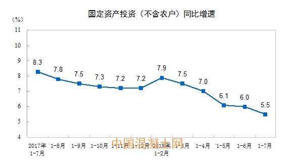 2018年1-7月份,全國固定資產投資(不含農戶)355798億元,同比增長5.5%,增速比1-6月份回落0.5個百分點。從環比速度看,7月份固定資產投資(不含農戶)增長0.43%。其中,民間固定資產投資222649億元,同比增長8.8%。