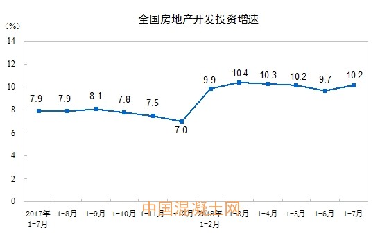 2018年1-7月份,全國房地產開發投資65886億元,同比增長10.2%,增速比1-6月份提高0.5個百分點。其中,住宅投資46443億元,增長14.2%,增速提高0.6個百分點。住宅投資占房地產開發投資的比重為70.5%。