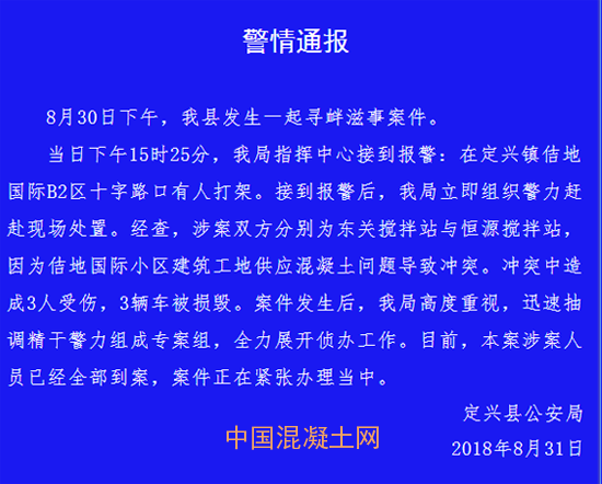 根據(jù)《通報(bào)》,8月30日下午15時(shí)25分,定興縣公安局指揮中心接到報(bào)警:在定興鎮(zhèn)佶地國際B2區(qū)十字路口有人打架。接到報(bào)警后,該局立即組織警力趕赴現(xiàn)場處置。經(jīng)查,涉案雙方分別為東關(guān)攪拌站與恒源攪拌站,因?yàn)橘サ貒H小區(qū)建筑工地供應(yīng)混凝土問題導(dǎo)致沖突。沖突中造成3人受傷,3輛車被損毀。案件發(fā)生后,該局高度重視,迅速抽調(diào)精干警力組成專案組,全力展開偵辦工作。目前,本案涉案人員已經(jīng)全部到案,案件正在緊張辦理當(dāng)中。
