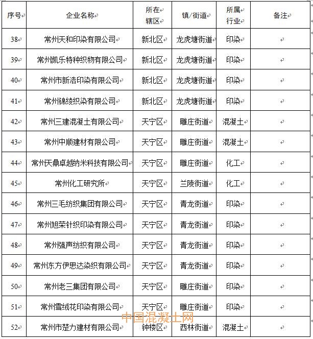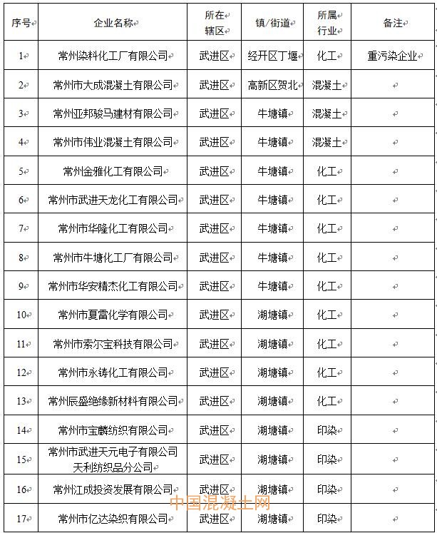 常州市城區(qū)范圍內(nèi)混凝土、化工、印染企業(yè)清單