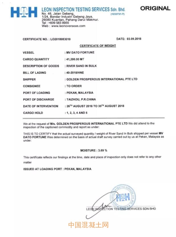 根據馬來西亞LEON INSPECTION TESTING SERVICES Sdn.Bhd.的商檢信息(本船砂的總量為41200噸、氯離子:0.0043%;水分:3.69%、泥含量:0.90%、細度模數:3.00)。