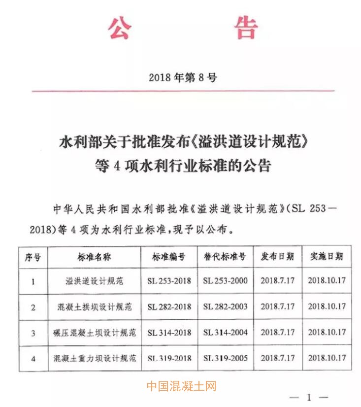 日前,水利部發(fā)布公告(2018年第8號),批準(zhǔn)發(fā)布《混凝土重力壩設(shè)計規(guī)范》(SL319-2018)、《混凝土拱壩設(shè)計規(guī)范》(SL282-2018)、《碾壓混凝土壩設(shè)計規(guī)范》(SL314-2018)和《溢洪道設(shè)計規(guī)范》(SL253-2018)等4項水利行業(yè)標(biāo)準(zhǔn),自2018年10月17日起實施,將分別替代SL319-2005、SL282-2003、 SL314-2004和SL253-2000。