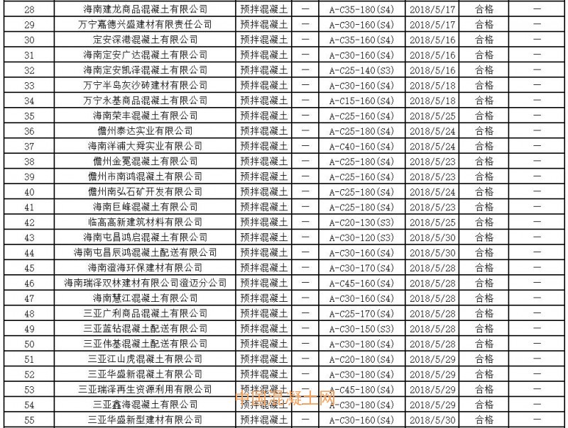 2018年海南省預拌混凝土產品質量省級監督抽查產品及其企業名單