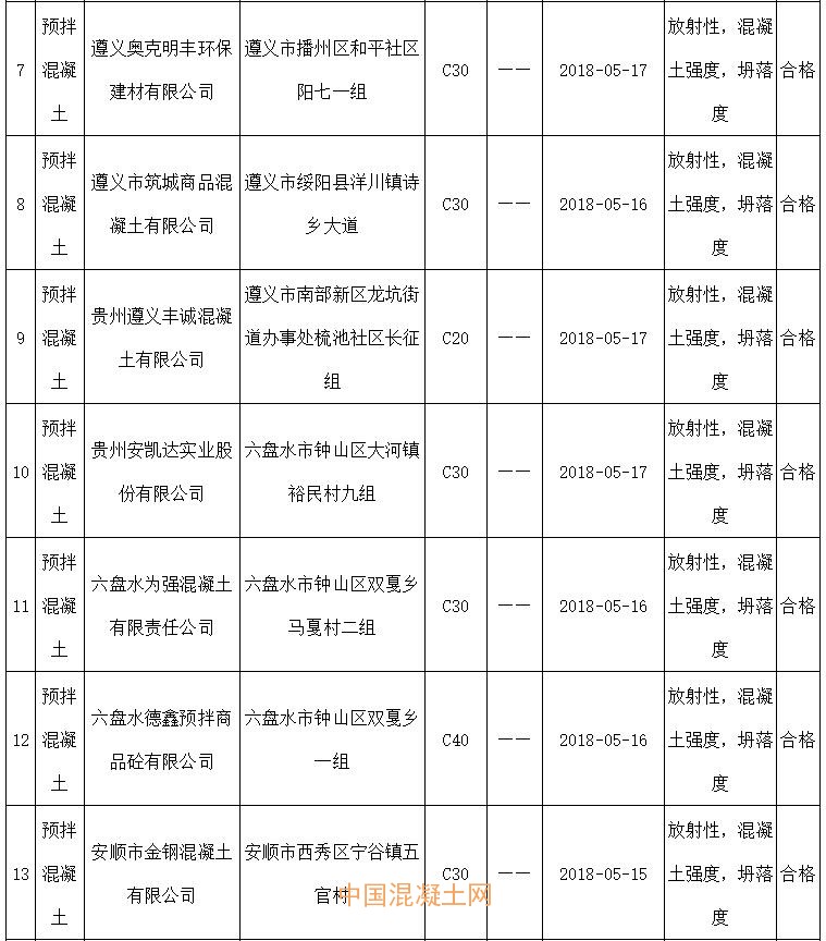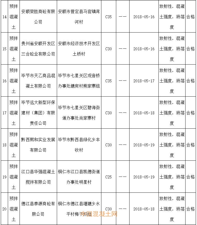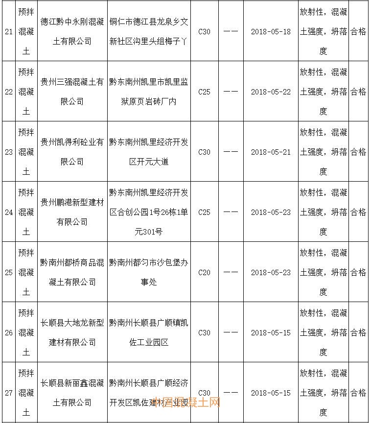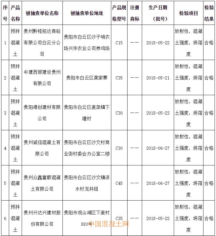 2018年預拌混凝土產品質量監督抽查產品及企業名單
