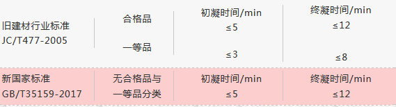 新標取消了速凝劑合格品與一等品的區分,凈漿的初凝時間與終凝時間參數同樣只有一條合格指標。