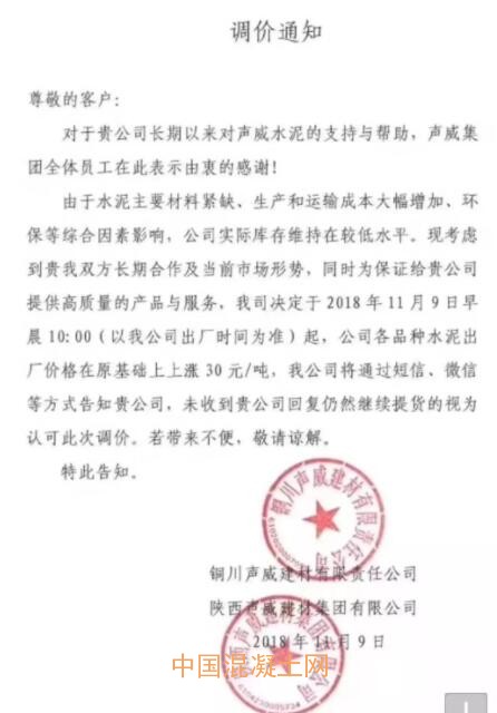 11月9日陜西水泥企業統一同步給混凝土企業發布水泥調價函:宣布各品種水泥出廠價格在原價格基礎上再次上調30元/噸!