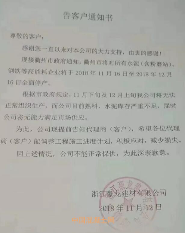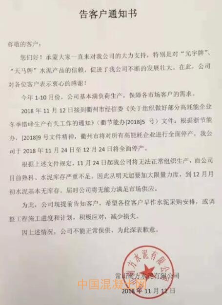近日,浙江衢州,蘭溪等地水泥廠發(fā)布告客戶通知書:當(dāng)?shù)厥姓?jīng)信委發(fā)布文件《關(guān)于組織做好部分高耗能企業(yè)冬季錯峰生產(chǎn)有關(guān)工作的通知》,根據(jù)浙節(jié)能辦文件精神,部分城市水泥廠2018年11月24日—12月24日將全面停產(chǎn)。