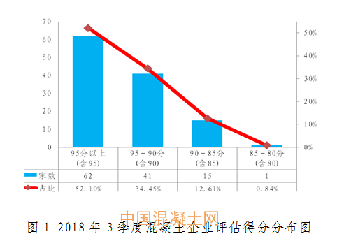 三季度評估平均分為94.29,較一季度提高0.16分。得分在95分(含95分)以上的混凝土企業共有62家,占總數的52.1%;95-90分(含90分)之間的混凝土企業共有41家,占總數的34.45%;90-85分(含85分)之間混凝土企業共有15家,占總數的12.61%;85-80分(含80分)之間混凝土企業共有1家,占總數的0.84%。具體得分分布見圖1。