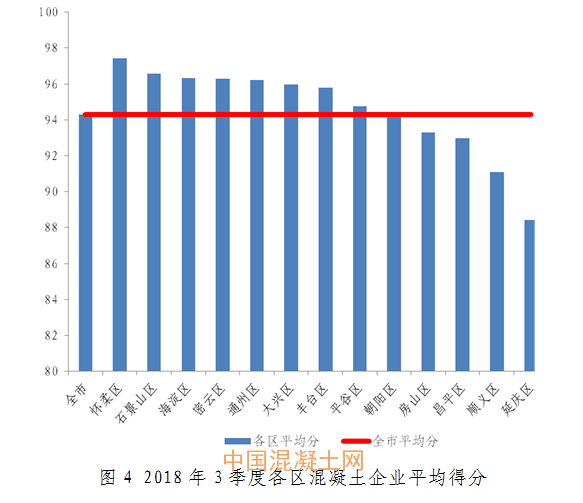 三季度得分最高的企業是北京市高強混凝土有限責任公司第一攪拌站,分數為99.18分。得分最低企業是北京潼潮混凝土有限公司,分數為84.04分。全市混凝土企業得分排名詳見附件2。