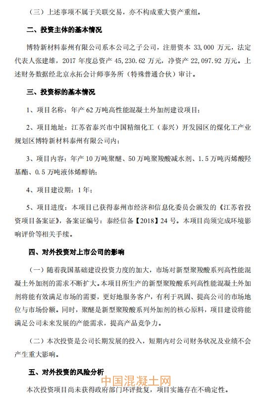 12月3日晚間,蘇博特(603916)發(fā)布公告稱,為進一步提升公司制造工藝,提高公司高性能混凝土的生產(chǎn)供應能力,公司子公司博特新材料泰州有限公司擬在江蘇省泰興市投資建設(shè)年產(chǎn)62萬噸高性能混凝土外加劑建設(shè)項目,投資金額為1.38億元。主要建設(shè)內(nèi)容包括年產(chǎn)10萬噸聚醚、50萬噸聚羧酸減水劑、1.5萬噸丙烯酸羥基酯、0.5萬噸液體烯醇鈉。