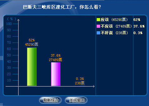 截止4月3日下午15時正調查顯示,共有71.7%(28154票)網友表示,巴斯夫沒有隱瞞排污信息;更有62%(45290票)的網友對巴斯夫在三峽庫區建化工廠表示支持,留言在后來也變成了一邊倒的贊助。與調查推出之初的結果相比,這無疑是上演了一幕“絕地反攻”。記得有款節目里主持人總是問,你確定嗎?看到這樣的調查結果,更多細心的網友紛紛留言表示“我確定嗎”。而此前,反對的聲浪是非常高的。