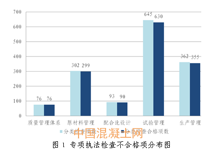 三季度專項執(zhí)法檢查內容包括:預拌混凝土企業(yè)的質量管理體系、原材料管理、配合比設計、試驗管理、生產管理等方面,共計檢查預拌混凝土企業(yè)34家次,1478項次,其中合格1450項,合格率為98.1%,不合格項主要出現(xiàn)在試驗管理方面,具體情況見圖1。在執(zhí)法檢查的同時對預拌混凝土試塊(拌合物)、原材料進行了抽檢,其中抽檢混凝土試塊(拌合物)115組,合格113組,合格率為98.3%,預拌混凝土出廠質量良好;抽檢原材料67組,全部合格。總體來看,北京市預拌混凝土質量整體穩(wěn)定可靠。
