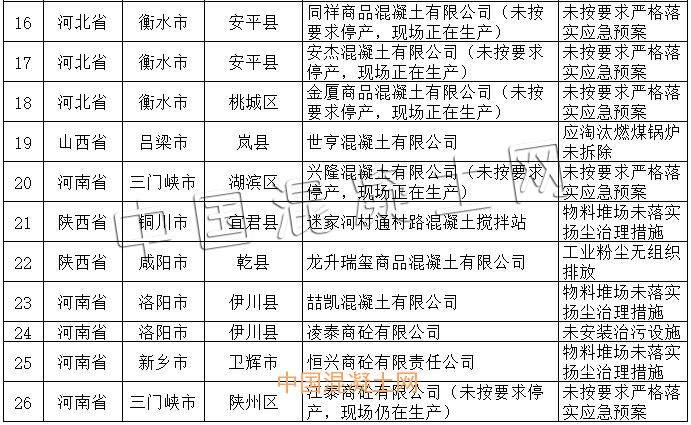 據生態環境部消息,2018-2019年藍天保衛戰重點區域強化監督工作繼續開展,12月11日-16日,共有26家混凝土企業被發現涉氣環境問題,問題主要包括:物料堆場未落實揚塵治理措施、應淘汰燃煤鍋爐未拆除、未按要求停產、工業粉塵無組織排放、未安裝治污設施等。