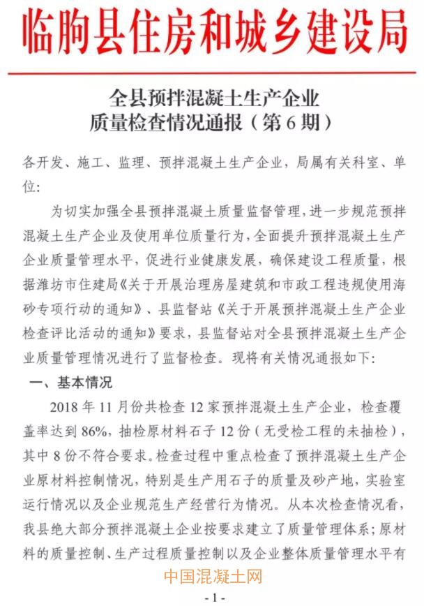 近日,山東省臨朐縣住建局發布全縣預拌混凝土生產企業質量檢查情況通報,具體通報情況如下:
