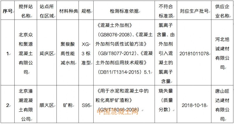 抽檢水泥、砂子、石子、外加劑、粉煤灰、礦粉等六類混凝土原材料166組樣品進行質量檢測,檢測結果合格的為164組,抽樣合格率98.8%。根據檢測結果,發現2家混凝土攪拌站共計2組樣品檢測結果不符合質量標準要求。其中,北京眾和聚源混凝土有限公司采購使用由河北旭誠建材有限公司供應的XG-3標準型聚羧酸高性能減水劑(生產批號為20181011078)氯離子含量、由外加劑引入混凝土的氯離子含量檢測結果不符合標準指標要求;北京潼潮混凝土有限公司采購使用由唐山旺達建材有限公司供應的S95級礦粉(生產批號為2018-10-18)燒失量(質量分數)的檢測結果不符合標準指標要求(詳見附表)。