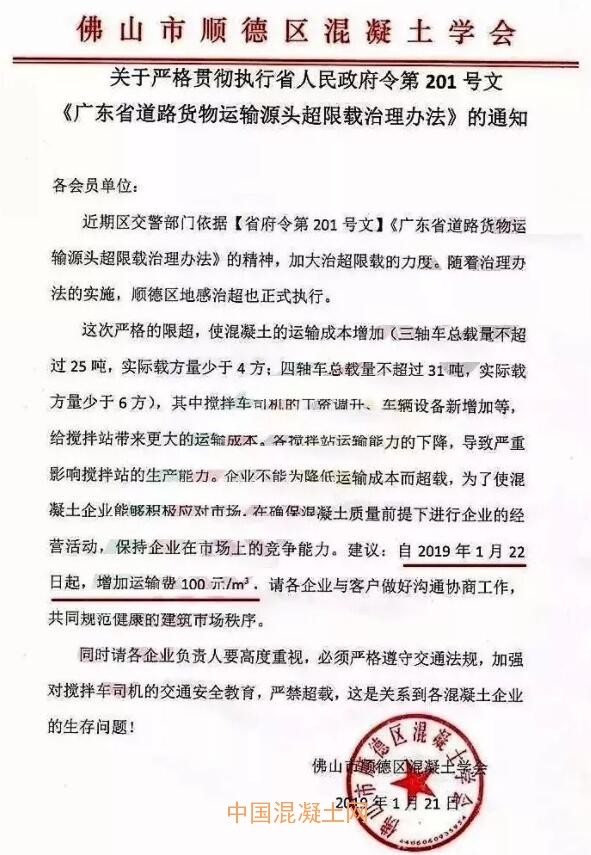 日前,廣東省佛山市順德區混凝土學會發布《關于嚴格貫徹執行省人民政府令第201號文<廣東省道路貨物運輸源頭超限載治理辦法>的通知》。